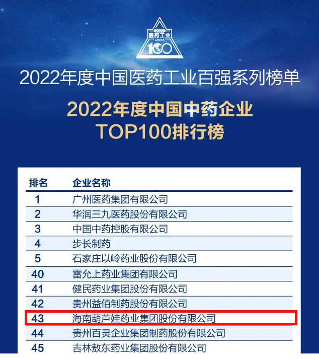 会议期间,一年一度的中国医药工业百强系列榜单隆重揭晓,尊龙凯时-人生就是搏药业集团凭借领先的研发优势和扎实的生产实力以及稳健的市场推广能力,连续第四年成功入选“2022年度中国中药企业TOP100排行榜” ,排名稳步上升至第43位。